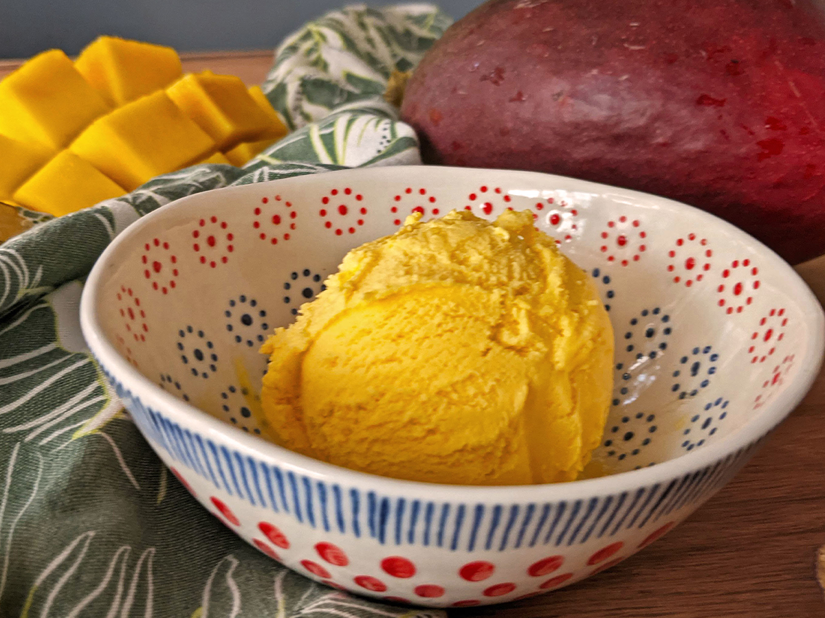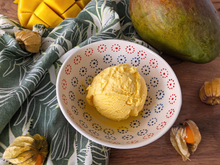 O inghetata racoritoare cu mult mango dar fara zahar adaugat, perfecta penturu o zi insorita.