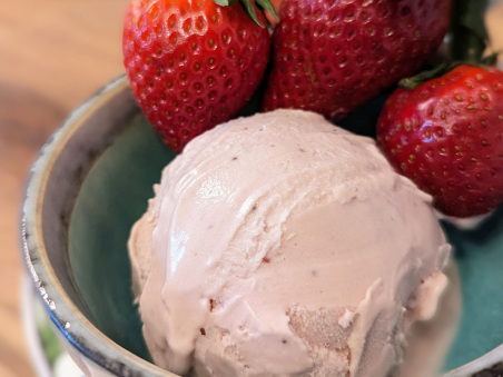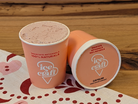 Un clasic îndrăgit: înghețata de căpșuni, cu un gust intens și autentic, obținut exclusiv din căpșuni proaspete și un strop de zeamă de lămâie.