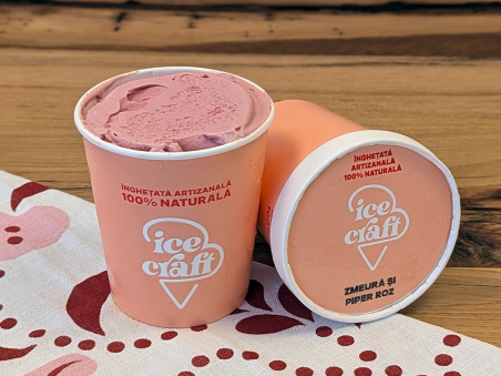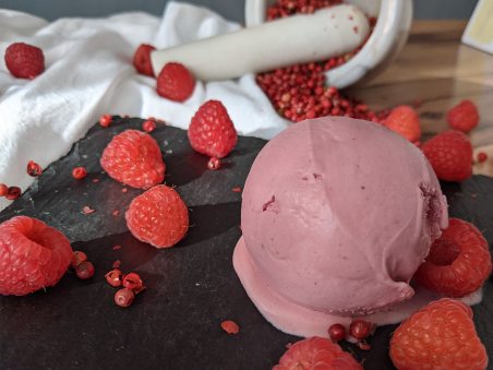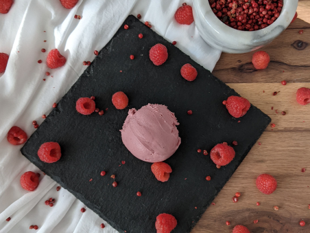 Piperul roz este un fruct tip “berries” (fructe de padure) cu arome citrice și puțin piperate. Piperul roz este folosit într-o cantitate mica, cat sa complementeze zmeura dar fără să iuțească înghețata.